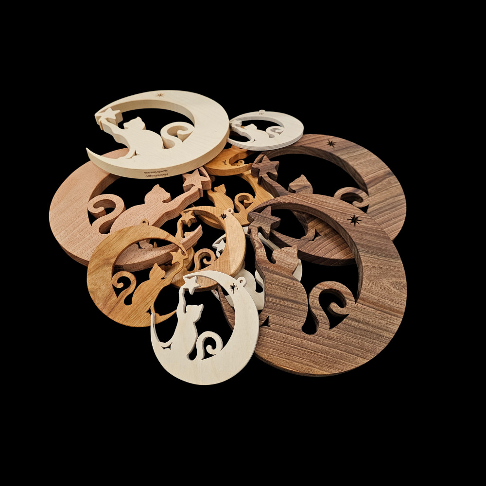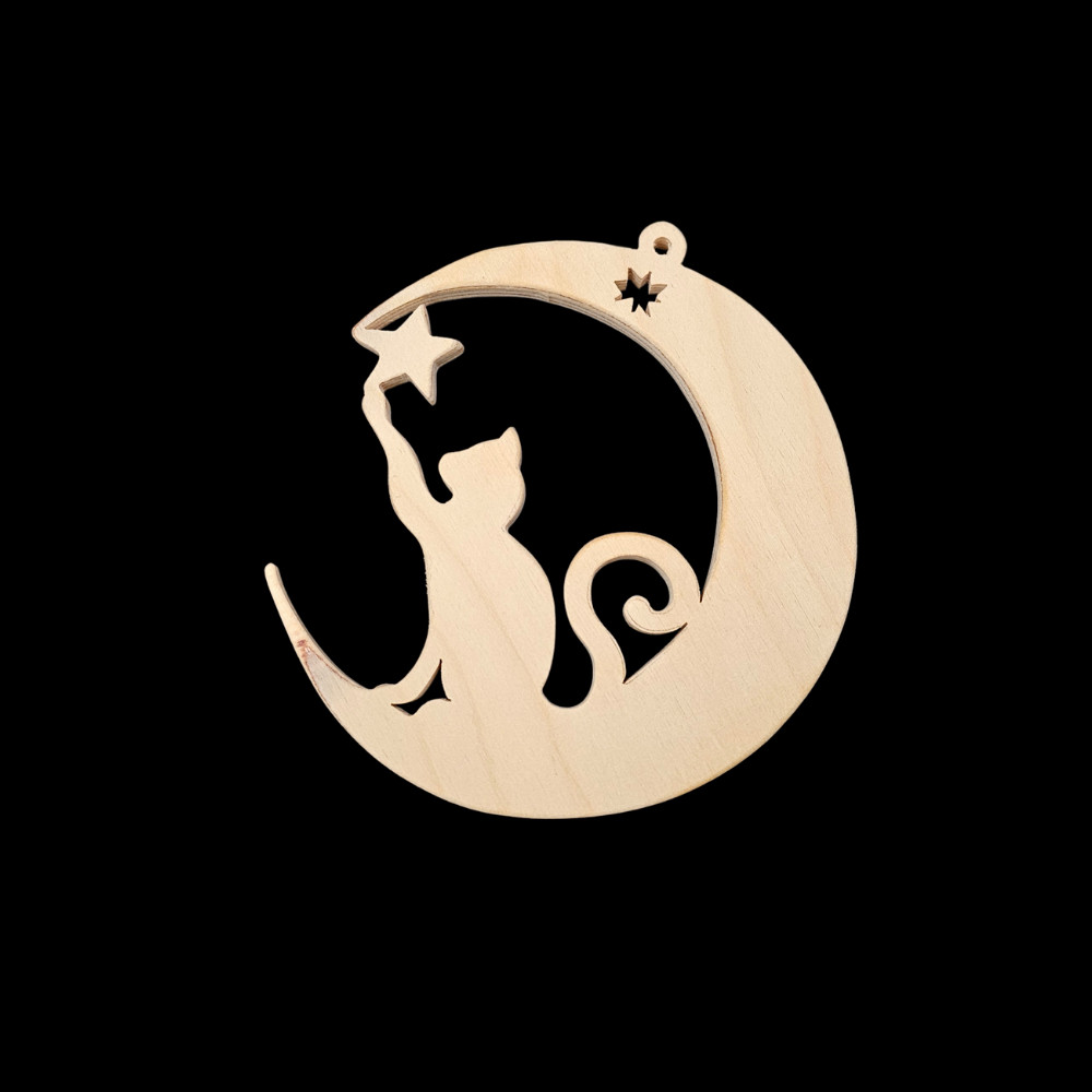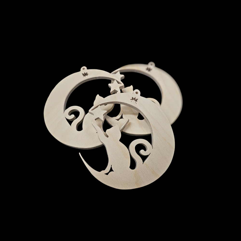 Fából készült cicás karácsonyfadísz, hold és csillag motívummal/Cicás fa karácsonyfadísz – hold és csillag motívummal