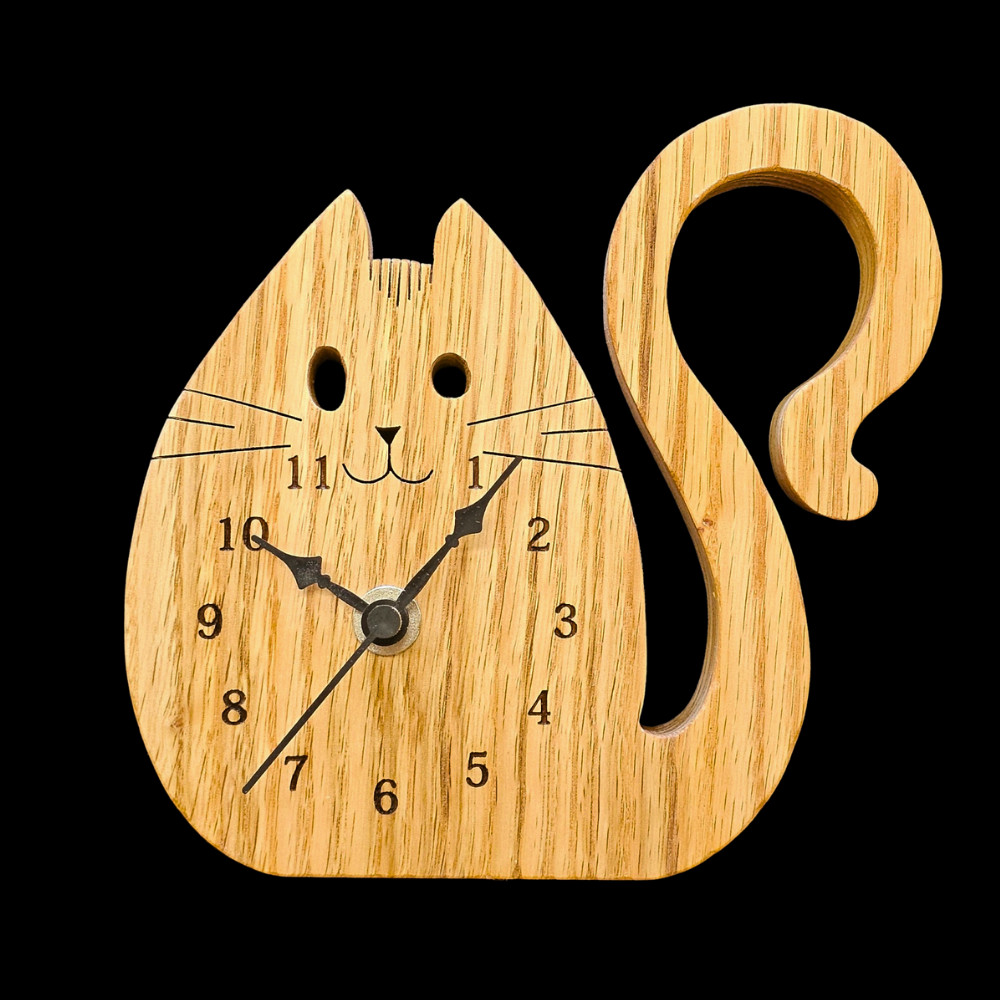 The finely crafted oak wood base blends beautifully into modern, Scandinavian, or rustic interiors. The cat’s head with diferent -shaped eyes, delicate details, and an elegant tail design makes this clock truly special. Clearly visible numbers, classic black hands, and a quiet, smooth-running clock mechanism ensure practical and comfortable everyday use.