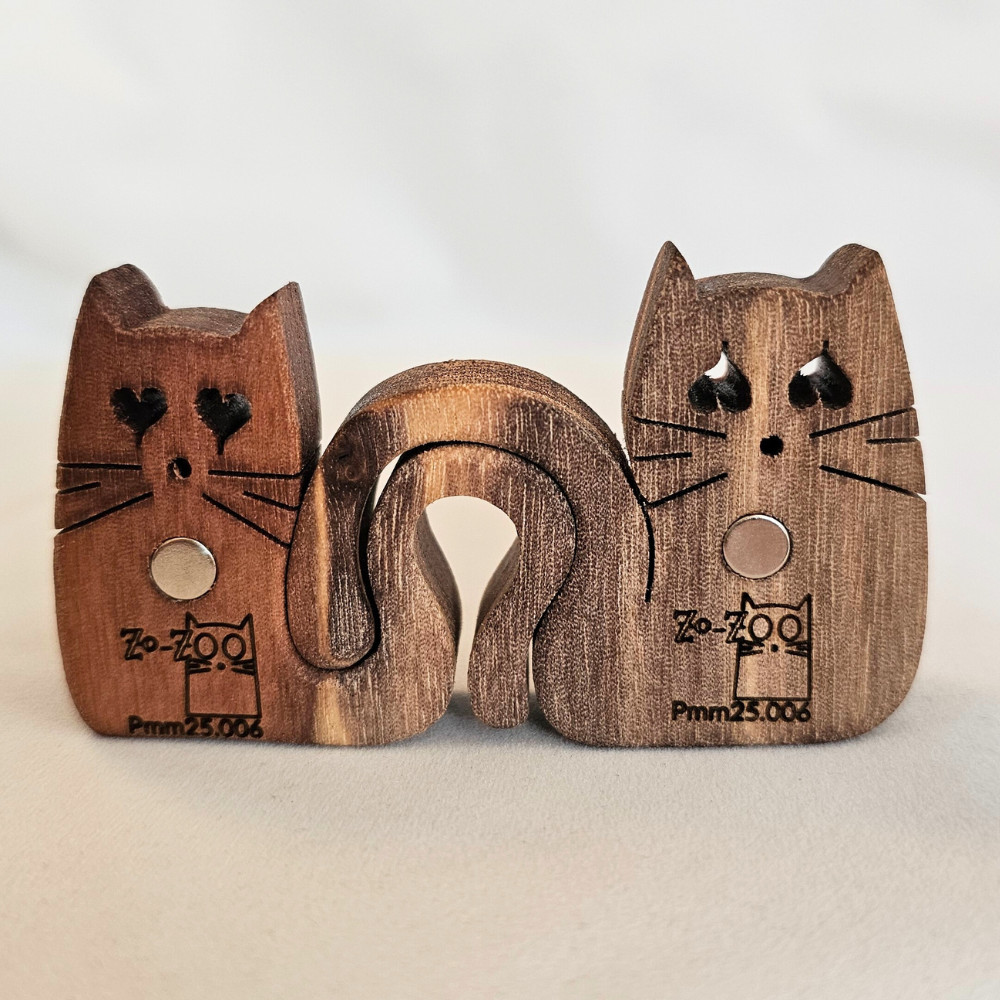 A Zo-ZOO World  mágneses cicapárjai lombfűrésszel készülnek különböző fa alapanyagokból és két egymáshoz tartozó, szerethető cica figurából áll. A cicák formája és finom részletei, ölelkező farkincájuk  kedves, harmonikus összhatást alkotnak, így igazán különleges díszei lehetnek otthonodnak vagy igazi meglepetést szerezhetsz Barátodnak, Kedvesednek.