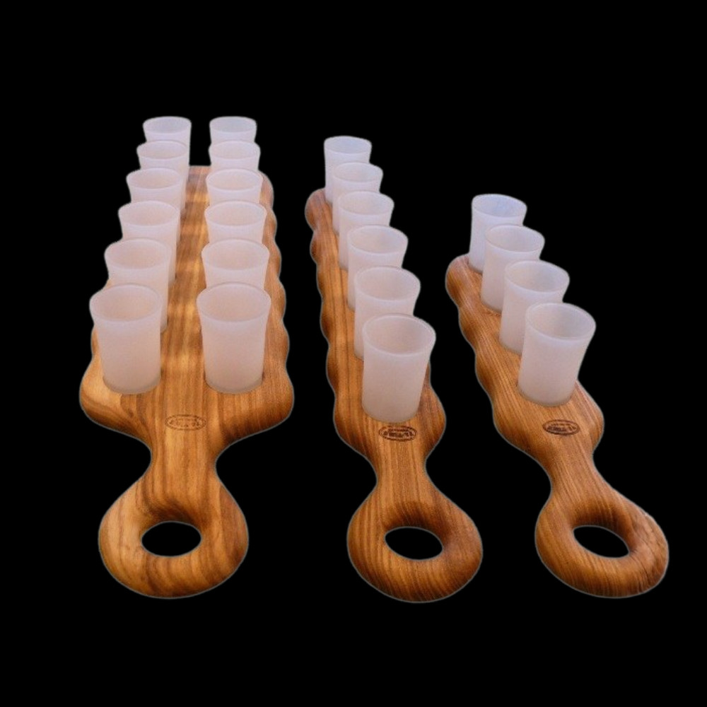 Kőrisfából és japán akácból készítjük, homokfúvott féldecis poharakkal. Bármilyen színben elkészítjük.